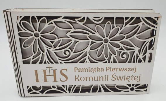 Banknotówka na pieniądze 10 x 15,5cm ażur biała KOMUNIA ŚW IHS