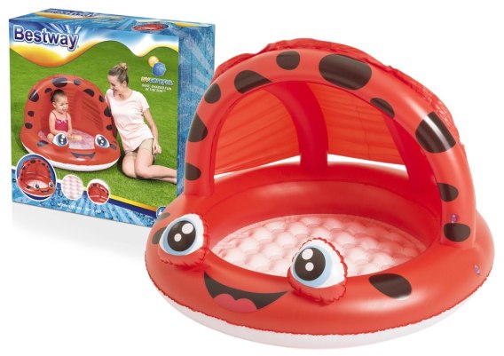 Dmuchany brodzik to idealnie rozwiązanie dla maluszków w upalne dni. Jest łatwy do nadmuchania, opróżniania i przechowywania przy czym świetnie sprawdza się podczas pierwszego kontaktu dzieci z wodą. Basen jest w motywie czerwonej żabki z pewnością przyciągnie wzrok i spodoba się najmłodszym. Ściany boczne zapewniają dzieciom bezpieczeństwo i ułatwiają monitorowanie ich zabawy. Dmuchany daszek skutecznie ochroni przed promieniami słonecznymi.