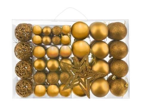 SPECYFIKACJA - kolor: złoty; materiał: tworzywo sztuczne; ilość sztuk w zestawie: 100 + gwiazda; rodzaje bombek: matowe, brokatowe, błyszczące, ażurowe; średnice bombek: 6/4/3 cm; wymiary gwiazdy (dł/szer): 12/14 cm; waga: 0,7 kg; waga w opakowaniu: 0,9 kg.