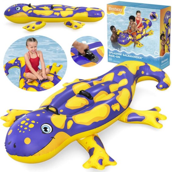Dmuchany kolorowy materac w kształcie salamandry to najnowsza propozycja firmy Bestway na nadchodzące lato. Ciekawa grafika, żywe kolory i nietypowy kształt na pewno spodoba się każdemu dziecku. Duży rozmiar materaca 191 x 119 cm oraz jego wykonanie sprawiają, że na grzbiecie salamandry spokojnie zmieści się dwoje dzieci. Materac posiada również 2 mocne uchwyty do trzymania, dzięki którym dzieciom łatwiej utrzymać się na nim podczas zabawy. Uchwyt można również wykorzystać podczas przenoszenia materaca. Dzięki wykonaniu z wytrzymałego tworzywa, dwóm niezależnym komorom powietrza oraz zaworom zapobiegjącym jego wydostawaniu się zabawa będzie bezpieczna. Materac jest stabilny i bezpieczny przeznaczony dla dzieci od 3 roku życia, a maksymalne obciążenie wynosi 60 kg (2x 30 kg) Ten rewelacyjny, dmuchany materac świetnie sprawdzi się podczas niejednych wakacji. W basenie, nad jeziorem, nad morzem czy na plaży zabawa będzie wspaniała a wypoczynek udany.