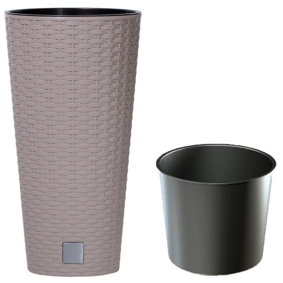 • Wysoka, smukła doniczka z kolekcji Rato o fakturze przypominającej plecionkę z naturalnego rattanu. Funkcjonalna, o ciepłym, egzotycznym charakterze, stanowi doskonałe uzupełnienie stylowej dekoracji wnętrz, aranżacji tarasów, werandy, ogrodów zimowych, ogródków restauracyjnych, barowych oraz kawiarnianych. W zestawie z donicą wkład.