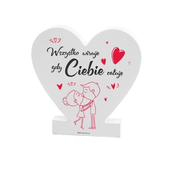 Drewniana tabliczka serce z podstawką wzbogacona lakierem UV z napisem "Wszystko wiruje gdy ciebie całuję"