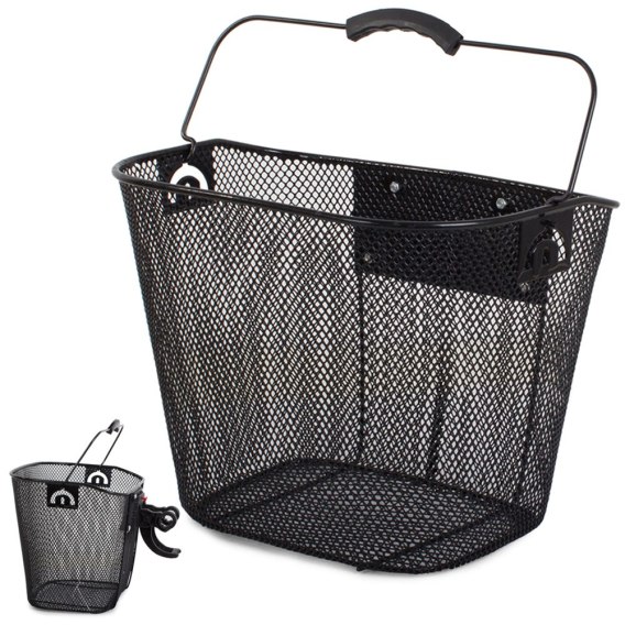 Koszyk jest dość pojemny, zmieści torbę i plecak, a także małe zakupy. Dodatkowo posiada wygodną rączkę do przenoszenia. Pasuje do większości rowerów ze średnicą kierownicy do 2,5cm.
