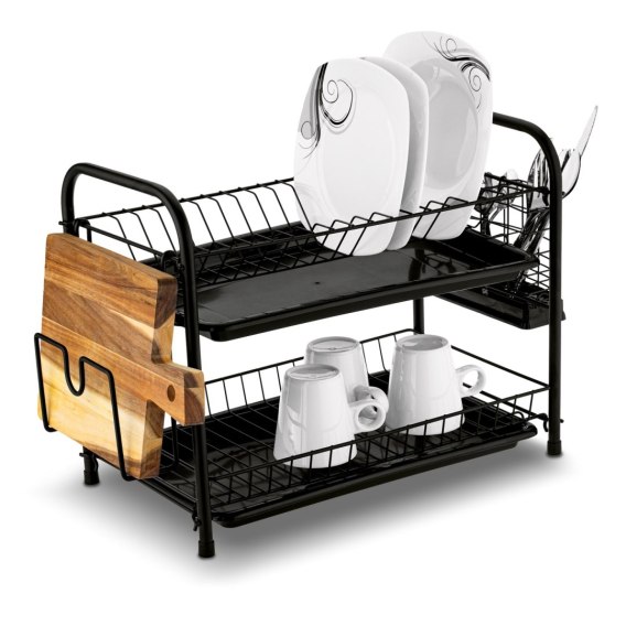 Dwupoziomowy ociekacz do naczyń z uchwytem na deskę do krojenia i pojemnikiem na sztućce Nova 53 x 33 x 24 cm czarna