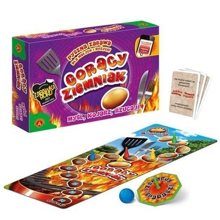 Przezabawna gra rodzinna, sprawdzająca refleks. Myśl, kojarz, rzucaj i pozbądź się Gorącego Ziemniaka zanim się sparzysz! Rozłóż planszę i połóż ją na stole. Grę rozpoczyna najniższy z graczy biorąc kulkowego "ziemniaka" do ręki. Osoba siedząca po jego prawej stronie wyciaga pierwszą kartę z talii i czyta na głos pytanie. Następnie energicznie kręci bączkiem lub uruchamia aplikację do odmierzania czasu dostępną do pobrania na smartfona. Ten, kto trzyma ziemniaka musi udzielić odpowiedzi na zadane pytanie i jak najszybciej przekazać kulkę osobie po naszej lewej stronie (zgodnie z ruchem wskazówek zegara) i ona również musi udzielić odpowiedzi na to samo pytanie. "Ziemniak" tak długo krąży pomiędzy graczami aż bączek odmierzający czas przestanie się kręcić lub aplikacja na telefonie pokaże stop. Wówczas osoba, która w tym momencie miała kulkę w ręce spada o jedno pole na planszy.