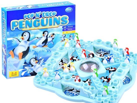 ZASADY GRY: Rozkładamy zestaw z umiejscowieniem mostów zwodzonych w przeznaczonych dla nich miejscach. Pingwinki ułożone kolorystycznie czekają na swoją kolej. Start zaczyna ta osoba, która po naciśnięciu przeźroczystej półkuli umiejscowionej na środku planszy wyrzuci na kostce 6 oczek. Plusem jest to, iż kostka jest zamknięta w półkuli i nie ma obawy, że gdzieś się zawieruszy. Pingwiny poruszają się o ilość oczek wskazanych przez kostkę. W trakcie gry można poruszać się tylko jednym pingwinkiem.