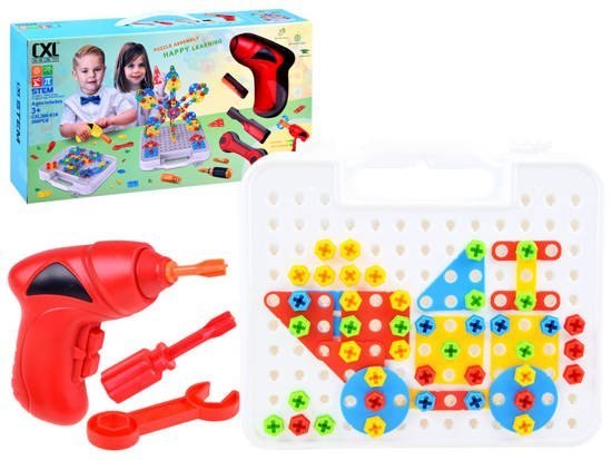 Zestaw zawiera: - walizka - elementy w kształtach: kwadrat, trójkąt, koło - śrubki do skręcania konstrukcji - wkrętarka (działa na 2 baterie 1,5 V AA) - klucz - śrubokręt