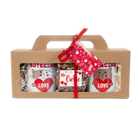 Komplet dwóch kubków "KOCHAM CIĘ KOTECZKU"," KOCHAM CIĘ MISIACZKU" + herbatka w ozdobnym opakowaniu