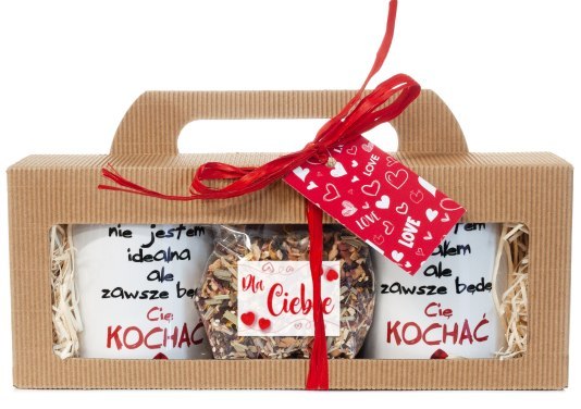 Komplet dwóch kubków "NIE JESTEM IDEALNA ALE...","NIE JESTEM IDEAŁEM ALE..." + herbatka w ozdobnym opakowaniu