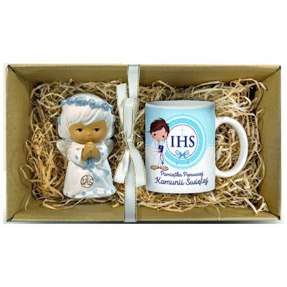 Komplet w pudełku kubek 330ml + aniołek 12cm NIEBIESKI KOMUNIA ŚW