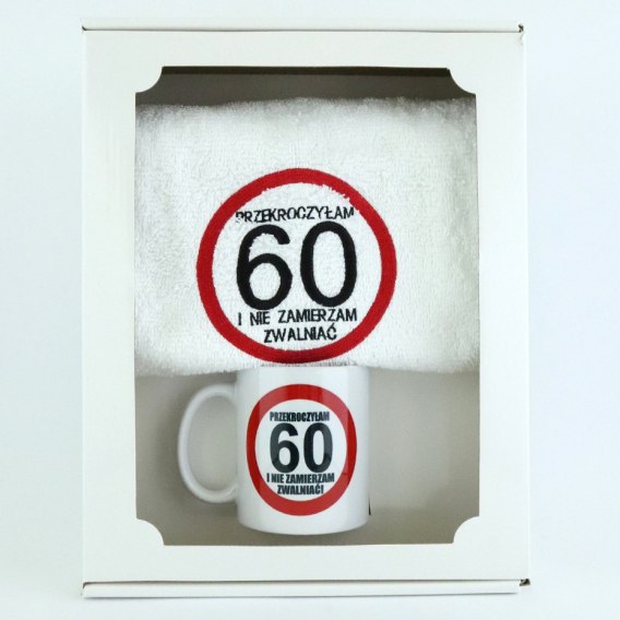 Kpl.ręcznik+kubek w pudełku ''PRZEKROCZYŁAM 60..''
