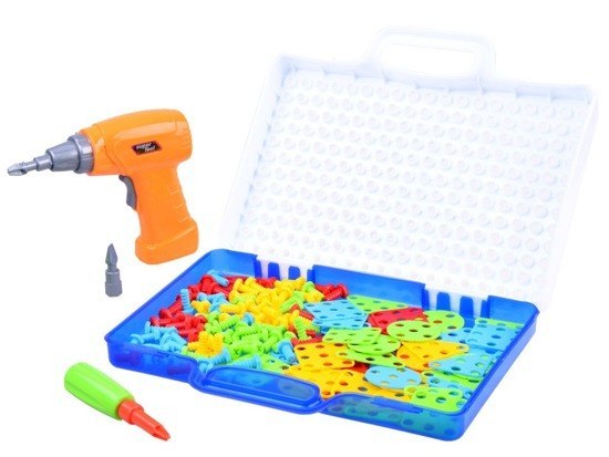 ZESTAW ZAWIERA: - wkrętarkę (zasilana jest 2 bateriami typu AA - 2 x 1,5V - brak w zestawie) - dwie wymienne końcówki wkrętarki - śrubokręt gwiazdka - kolorowe śrubki - kolorowe podkładki - książeczka z pomysłami - panel walizka z dziurkami (30 cm x 24 cm)