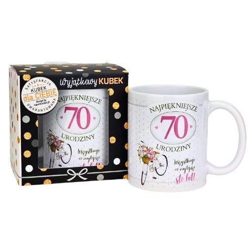 Taki kubek 70-stkowy sprawdzi się nie tylko jako prezent od rodziny, lecz również jako upominek od przyjaciół, koleżanek czy znajomych. Dzięki uniwersalnemu wzorowi oraz trwałemu wykonaniu będzie cieszył obdarowaną osobę przez długie lata.
