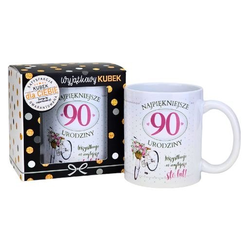 Taki kubek 90-stkowy sprawdzi się nie tylko jako prezent od rodziny, lecz również jako upominek od przyjaciół, koleżanek czy znajomych. Dzięki uniwersalnemu wzorowi oraz trwałemu wykonaniu będzie cieszył obdarowaną osobę przez długie lata.