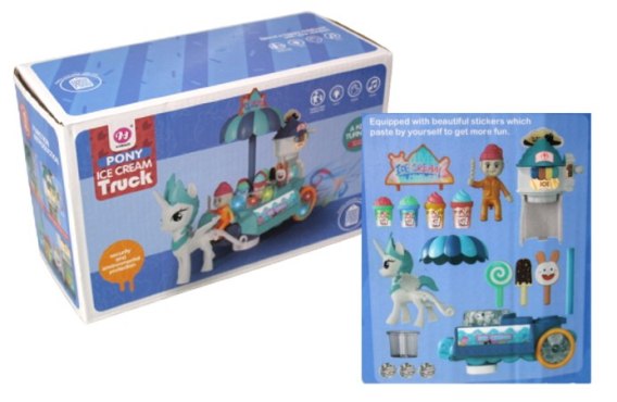 Kucyk z wózkiem lodziarnią, wydaje dźwięki, świeci, na baterie w kartonie 25x10,8x15,5 cm CH0017