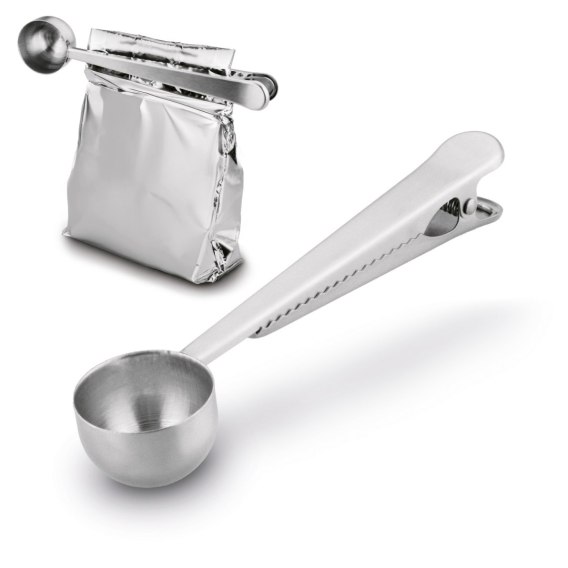 Wbudowany mocny klips pomagający zamknąć otwartą torebkę np. kawy