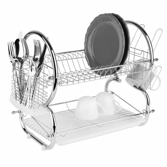 Ociekacz, na którym możesz suszyć naczynia na dwóch poziomach, a więc wygodnie i bez poświęcania produktowi zbyt wiele miejsca w przestrzeni kuchennej. Dodatkowym atutem modelu są specjalne uchwyty służące do stabilnego zawieszenia kubków i szklanek po ich umyciu. Nie zapomniano tu także o koszyczku na sztućce. U góry komfortowo ustawisz większe naczynia jak np. talerze. Na dolnym poziomie suszarki do naczyń zmieszczą się natomiast twoje domowe pojemniki spożywcze, miseczki, talerzyki deserowe oraz filiżanki. Trwała konstrukcja ociekacza do naczyń zostanie z tobą przez długi czas!