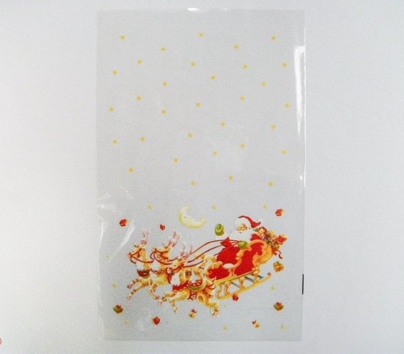 Worek prezentowy z nadrukiem gwiazdek i Mikołaja na saniach. Celofan wykonany z polipropylenu i jest delikatnie błyszczący, szeleszczący i przeźroczysty. Celofan najczęściej wykorzystuje się do pakowania prezentów, koszy upominkowych, kwiatów, paczek okolicznościowych, itp. Opakowanie zawiera 50 szt.