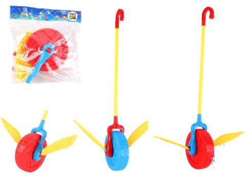 Prosty w obsłudze: Wystarczy pchać zabawkę, aby koło z kolorowymi skrzydełkami się kręciło.