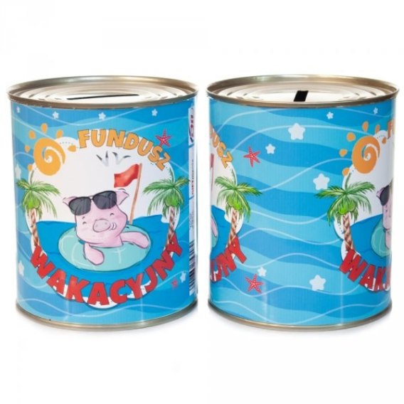 Skarbonka metalowa urodzinowa z napisem "Fundusz wakacyjny"