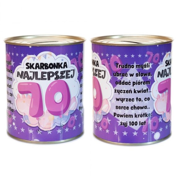 Skarbonka metalowa urodzinowa z napisem "Skarbonka Najlepszej 70"