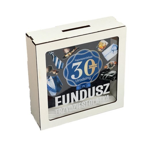 Skarbonka z okienkiem dla chłopaka z okazji 30 urodzin. Skarbonka z okienkiem z przeźroczystej plexi, które pozwala śledzić efekty oszczędzania. Pakowane w folię.