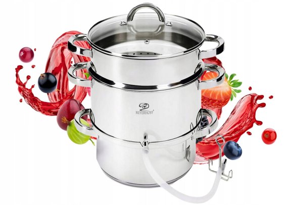 Sokownik 8L marki Meyerhoff Stahl Waren AG został wykonany z wysokiej jakości stali nierdzewnej, której największymi zaletami są trwałość i wytrzymałość. Odpowiednia grubość ścianek i wielowarstwowe dno sprawiają, że sokownik nagrzewa się bardzo szybko i utrzymuje stałą temperaturę wewnątrz. Dzięki temu, proces przyrządzania soku trwa od 30 minut do maksymalnie 1 godziny (wszystko zależy od twardości owoców). Używając tego naczynia, masz pewność, że nie zmarnujesz najmniejszej ilości żywności. Pozostały miąższ możesz wykorzystać do zrobienia domowych przetworów np. dżemu. Sokownik przystosowany jest do każdego typu kuchenki, w tym również do indukcji. Sok zostaje odprowadzony dzięki poręcznemu wężykowi do wybranego przez Ciebie naczynia. Możesz przygotować w nim warzywa lub mięso na parze, gdy odpowiednio go dostosujesz. Możliwość mycia w zmywarce.
