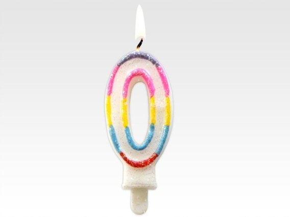 Świeczka urodzinowa ''0'' tęczowa + brokat - 24 szt. 62-40