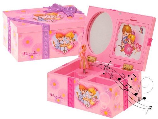 Bajeczna szkatułka na biżuterię z pozytywką, w której po otworzeniu, kręci się baletnica i płynie spokojna melodyjka. Z zewnątrz szkatułka ozdobiona jest kwiatami oraz zawiera wizerunek dziewczynki i chłopca siedzących na ławeczce. Po otwarciu Mała Strojnisia może przejrzeć się w owalnym lusterku znajdującym się na wewnętrznej stronie wieczka. Może również umieścić tuż obok podobiznę swoją lub ulubionego zwierzaka. W szkatułce znajdują się trzy przegródki do układania skarbów. Pozytywka nakręcana jest od spodu.