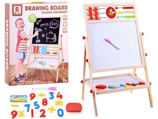 Tablica 2w1 to wersja tablicy magnetyczno kredowej. Tablica posiada dwie płaszczyzny na, której dziecko będzie mogło rysować, malować, pisać. Tablica jest w całości wykonana z drewnianych elementów. Została wzbogacona liczydłem, zegarem, cyframi przeznaczonymi do prostych działań matematycznych oraz, alfabetem.