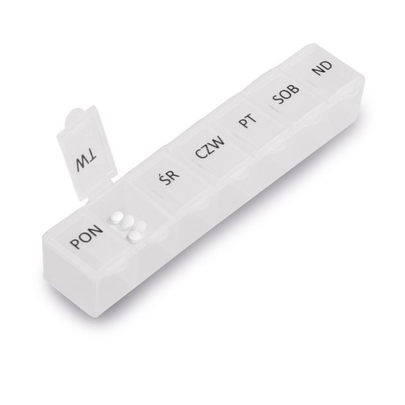 Produkt pomoże ci uporządkować i lepiej zorganizować przyjmowane lekarstwa. Z jego pomocą dopilnujesz odpowiednich dawek. Możesz przygotować je od razu na 7 dni z góry (polskie oznaczenia na wieczkach).