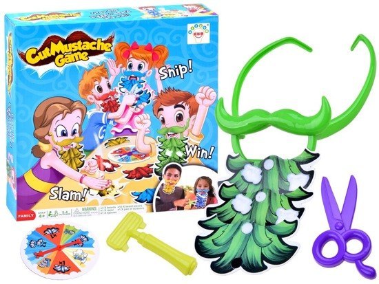 Zawartość pudełka: - uchwyty na brody (wąsy) w czterech kolorach, - 16 kart w kształcie brody, - nożyczki, - golarka, - tarcza ze wskazówką - rzepki. Nożyczki i golarka to atrapy, nie posiadają ostrych krawędzi i są bezpieczne dla dziecka.
