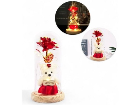 Wieczna róża w szkle z misiem i światłem LED - magia, która nigdy nie zniknie!