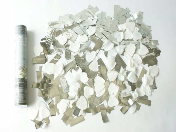 Wystrzałowe konfetti BIAŁE serca i srebrne serpentyny 25cm | 69-11