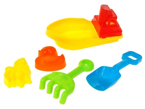 Zabawki do piasku 5 części, łódka 25 x 12 x 10cm z foremkami, łopatka i grabki