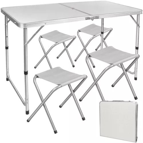 Zestaw kempingowy z 4 krzesełkami, zarówno dla dzieci jak i dorosłych doskonale sprawdzi się na wyprawach poza miasto, ale nie tylko - dzięki możliwości regulacji sprawdzi się doskonale jako zestaw podczas przyjęcia urodzinowego dla Twojego dziecka. Waży zaledwie niecałe 8kg, a dzięki możliwości przenoszenia go w formie walizki z uchwytem jego transport nie stanowi żadnego problemu. Blat stołu jest jednocześnie walizką, w której możemy schować krzesełka, posiada zabezpieczenia, dzięki którym nie ma ryzyka, że podczas transportu walizka się nie otworzy. Stół zaprojektowany został z ciekawym wzorem jest bardziej praktyczny podczas wycieczki niż biały. Kompaktowe wymiary pozwalają na przechowywanie go w kamperze, przyczepie kempingowej czy po prostu w bagażniku. Podczas wyjazdów bardzo ważna jest dobra organizacja miejsca, dlatego tak ważne jest, by produkt zajmował jak najmniej miejsca.