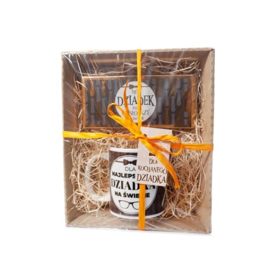 Zestaw prezentowy DLA DZIADKA Kubek i czekolada z motywem brązowych krawatów.