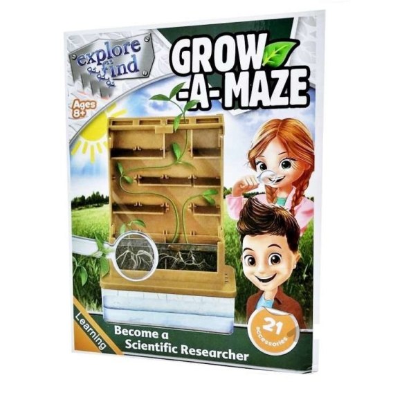 Miniaturowe obserwatorium zachwyci każdego małego botanika, który będzie mógł oglądać jak wyrasta z małego nasionka roślinka. Zestaw składa się z pojemnika na glebę oraz ścianki - przeźroczystej komory z labiryntem, w której będzie można obserwować wszystkie etapy wzrostu rośliny - od korzonków po gałązki i listki. Zestaw umożliwia zasadzenie dwóch roślinek i przyglądanie się, czy rosną jednakowo. Zabawę można powtarzać tworząc za każdym razem inny, coraz trudniejszy labirynt i obserwować, czy roślina da radę go rozwiązać. Do zestawu dołączono lupę do obserwacji, zakraplacz do podlewania roślinki oraz dwa tekturowe kartoniki zaciemniające pojemnik, dzięki którym można będzie przyglądać się tylko wyłącznie rozrostowi systemu korzeniowego.